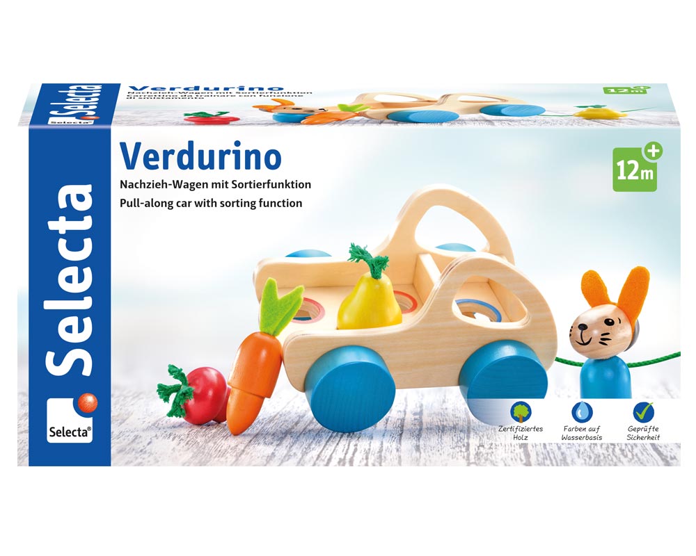 Put the fruits and vegetables into the car and let’s go. The little rabbit roars happily through the child’s room with his vegetable car. The sorting of the colourful plug-in elements playfully encourages the recognition and assignment of colours.