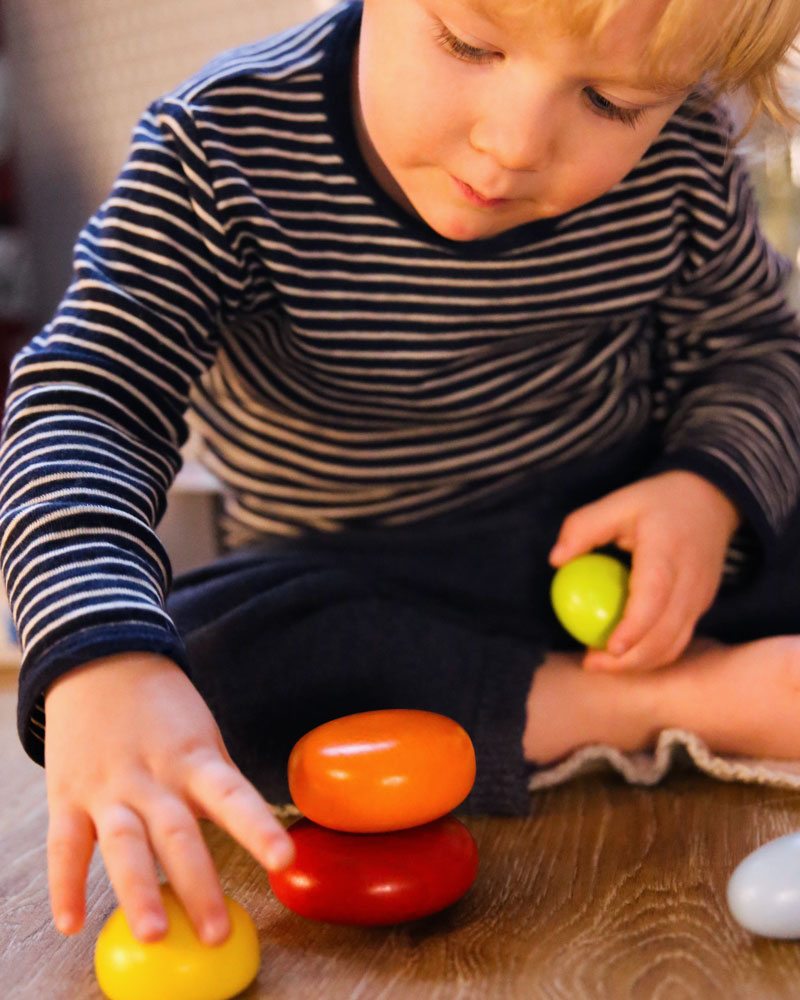Playing with stability and balance trains the motor skills in particular. Inspired by one of the ancestral traditions of erecting stone mounds, with a colourful modern interpretation. Ideal for at home and on the move.